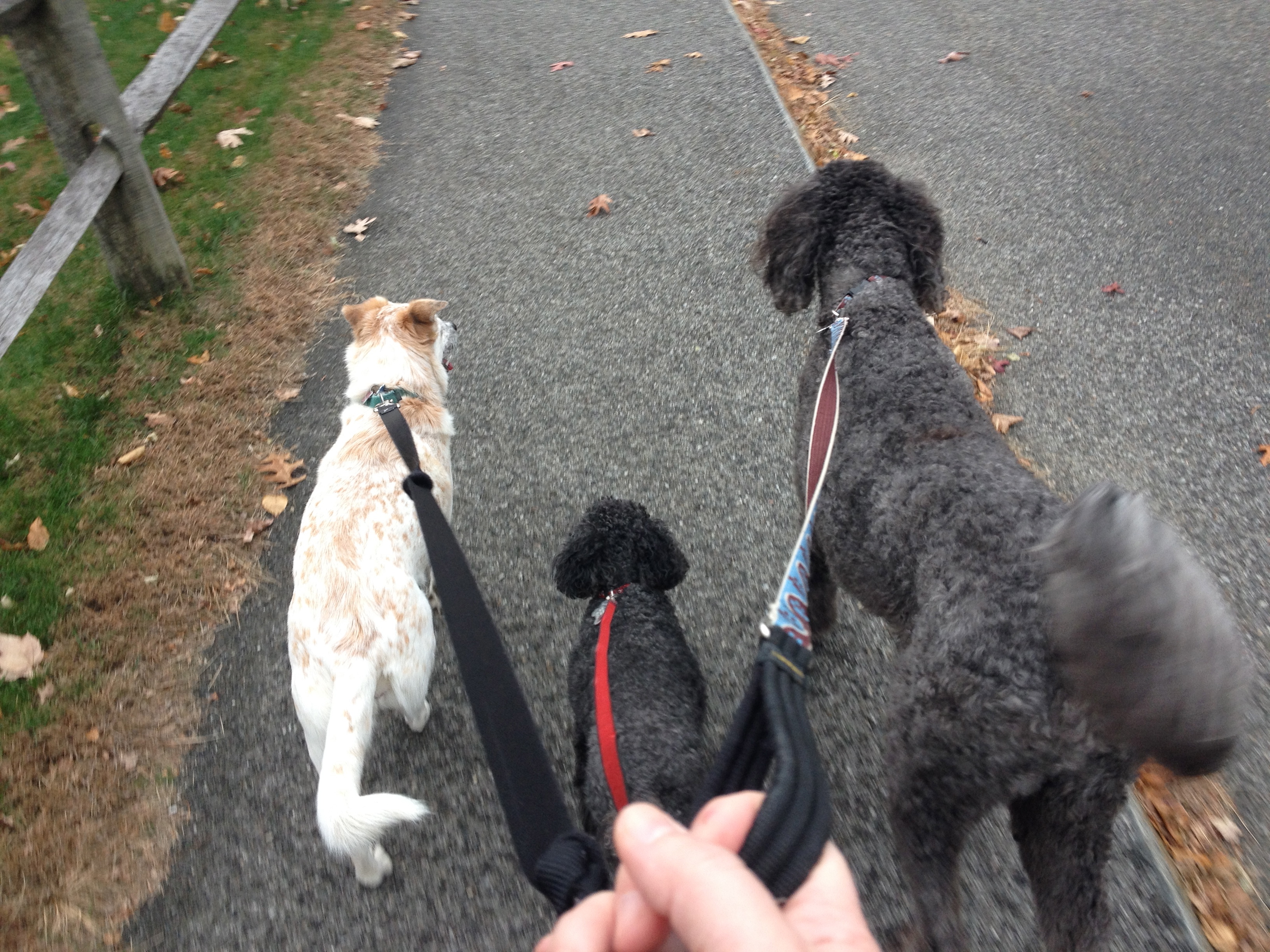 The two poodles are ours; the dog on the left was visiting for a few days.