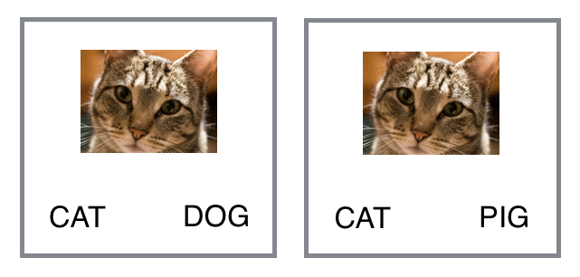 The learner’s task in this problem is to select the word that matches the picture. In this particular app there are performance reports included, broken down by concept. So I wanted to see how the reporting worked. Here’s how I distributed my responding with these two examples: when the cat picture was presented with the words cat and dog, I got the answer correct 50% of the time (which is chance level performance when 2 possible answers are available). When the cat picture was presented with the words cat and pig, I got the answer correct 100% of the time. Here’s where things get messy: the performance report said that I had 75% accuracy with the concept “Cat.” So let’s just forget about the fact that we don’t know for sure how that 75% was calculated (see story #1, above). The bigger problem is this: with my answers distributed the way they were the program should have concluded is that I don’t know “Cat” at all. Why do I say that? Because I had chance performance on cat vs. dog, showing that I don’t know “Cat” or “Dog.” The 100% accuracy on cat vs. pig is irrelevant because when we examine that in the context of the cat vs. dog results we can very easily conclude that the 100% accuracy is a result of my knowing “Pig.” Think of it this way: in cat vs. pig I may not be choosing “Cat,” but rather I may be choosing “Not Pig.” Does this make sense? We would want to have other problem types comparing dog vs. pig to test this. But the point here is that unless we understand what the data mean then we can’t report on them meaningfully.